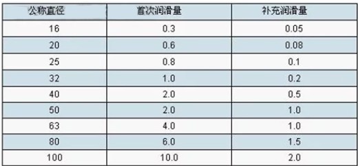 油潤滑的補充潤滑量和間隔按下表,按表中的潤滑量,至少可以達到8小時的補充潤滑時間。